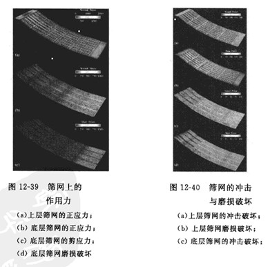 振動篩篩分的DEM仿真結(jié)果可以用于分析顆粒群再篩網(wǎng)上的松散度、振動強度、料層厚度、篩孔孔徑和篩面傾角等參數(shù)對分離粒度及篩分效率的影響及相互作用。顆粒群再篩網(wǎng)上的流動平衡、顆粒對篩網(wǎng)的沖擊速度計施加在篩網(wǎng)上的載荷也能通過DEM仿真結(jié)果獲得,從而確定篩網(wǎng)所受的應力、篩網(wǎng)的磨損及篩分裝置的功率、圖12-39和圖12-40分別為Yuan等人通過DEM仿真獲得的篩網(wǎng)上的作用力圖和篩網(wǎng)的沖擊與磨損破壞圖。